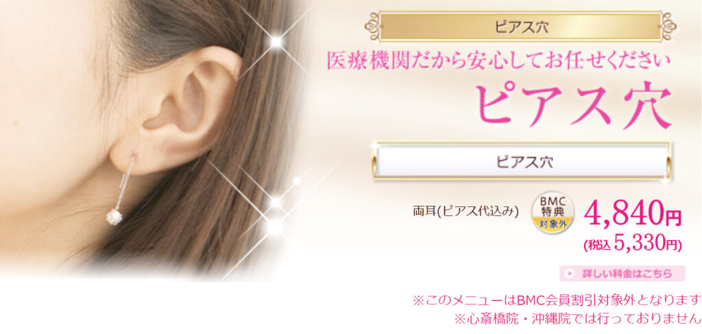 クリスティーナクリニック銀座では片耳や両耳などのメニューが用意されていて、特に両耳ともピアス穴あけを行うほうが安くなっています(片耳当たり3,850円