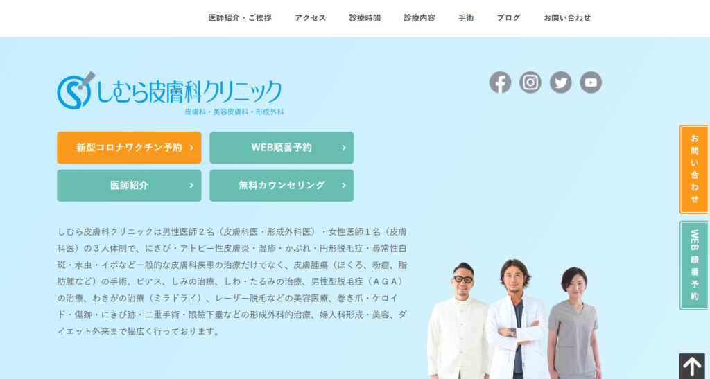 しむら皮膚科クリニックは男性医師2名と女性医師1名の3人体制で診療する皮膚科・美容皮膚科・形成外科で、GLP-1ダイエットでは内服薬や自己注射による方法を採用しています。