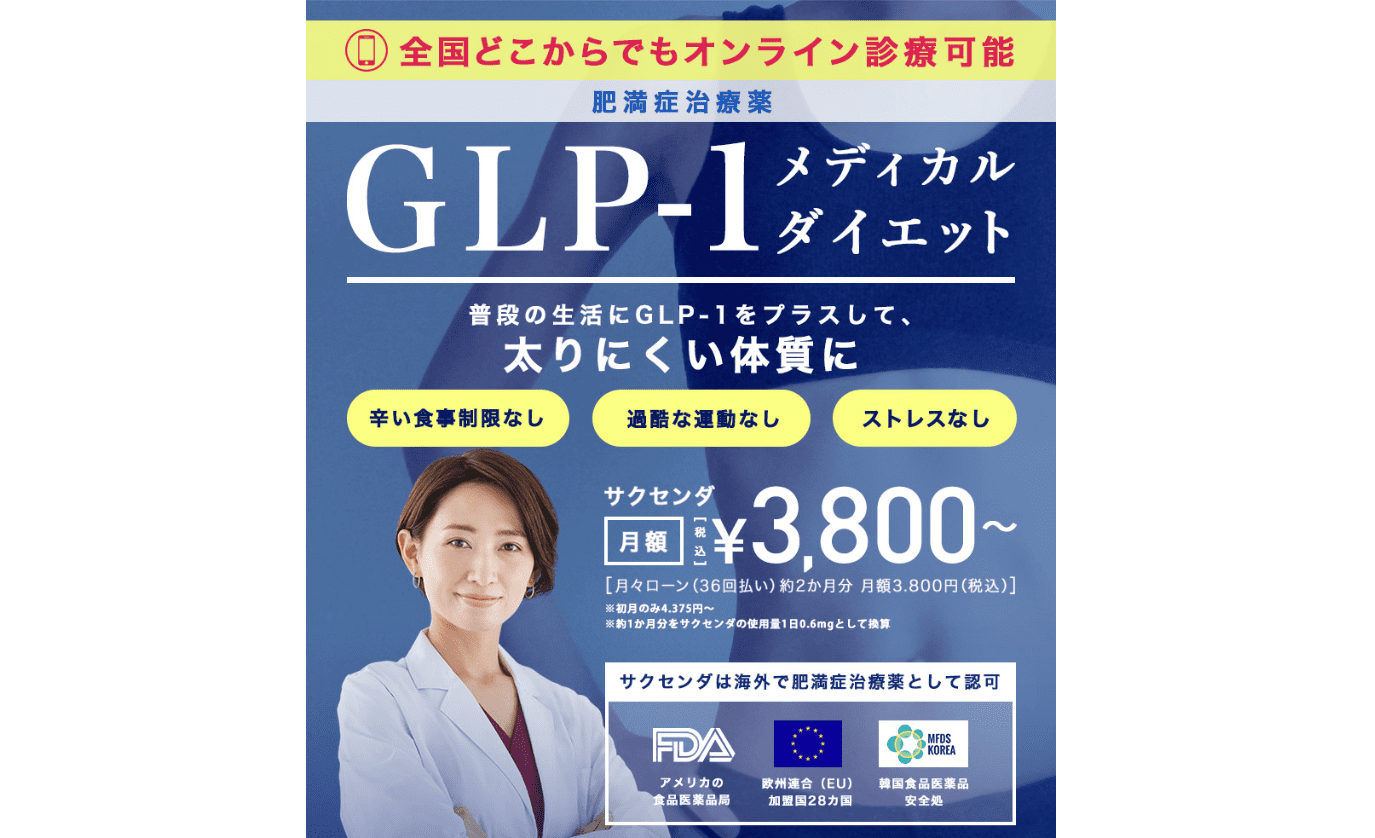 GLP-1ダイエットにはGLP-1(リベルサス)飲み薬や、GLP-1(サクセンダ)メディカルダイエット注射などがあり、どちらもお手頃な価格となっているので一度試してみたい方にもおすすめです。