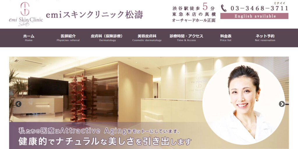 emiスキンクリニック松濤は2016年に開院された皮膚科・美容皮膚科で、ケミカルピーリングは顔または首1回9350円で受けられます。またイオン導入とセットで考えている場合は、導入液(ビタミンC)顔1回13,200円で受けられるのも魅力です。