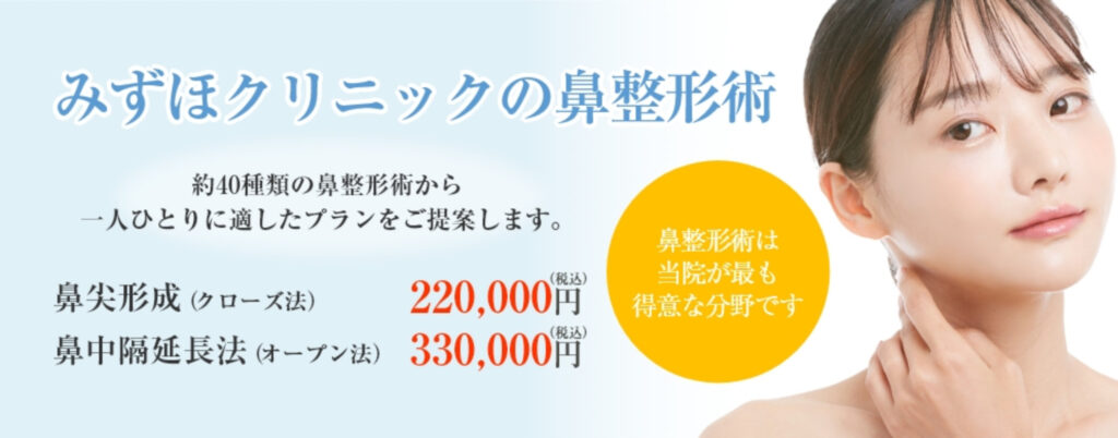 みずほクリニックは親しみやすさと温かさを大事にしている美容クリニックで、鼻整形では鼻筋や鼻先、小鼻、鼻の穴などの悩みに分けて治療を提案しています。