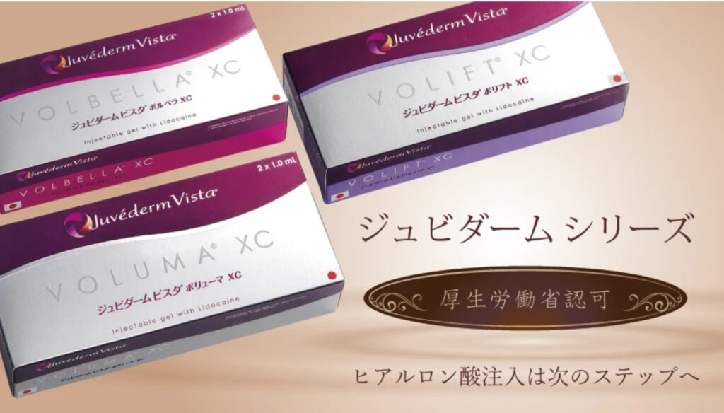 ヒアルロン酸注入ではヒアルロン酸製剤・ジュビダームビスタボリューマXC、またはFDA認可・RHAシリーズを使用しています。
