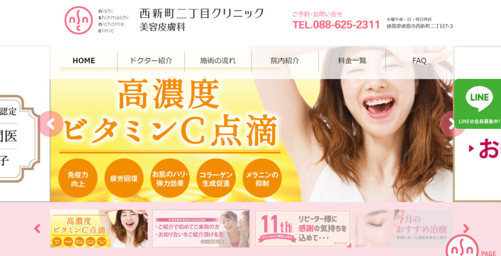 西新町二丁目クリニックは女性医師が副院長を務める美容皮膚科で、ヒアルロン酸注入ではシワやたるみを中心に改善を目指した施術を行っています。