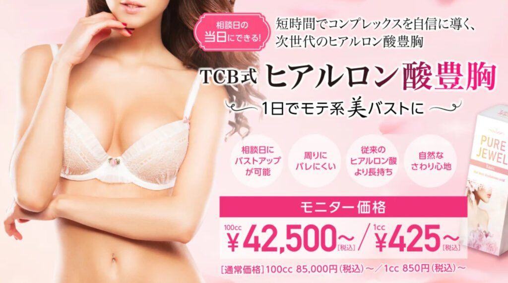 TCB東京中央美容外科は全国に50院以上も展開している大手美容クリニックで、豊胸やバストアップではTCB式ヒアルロン酸豊胸というメニューが用意されています。