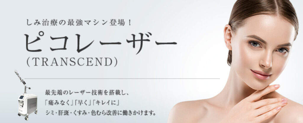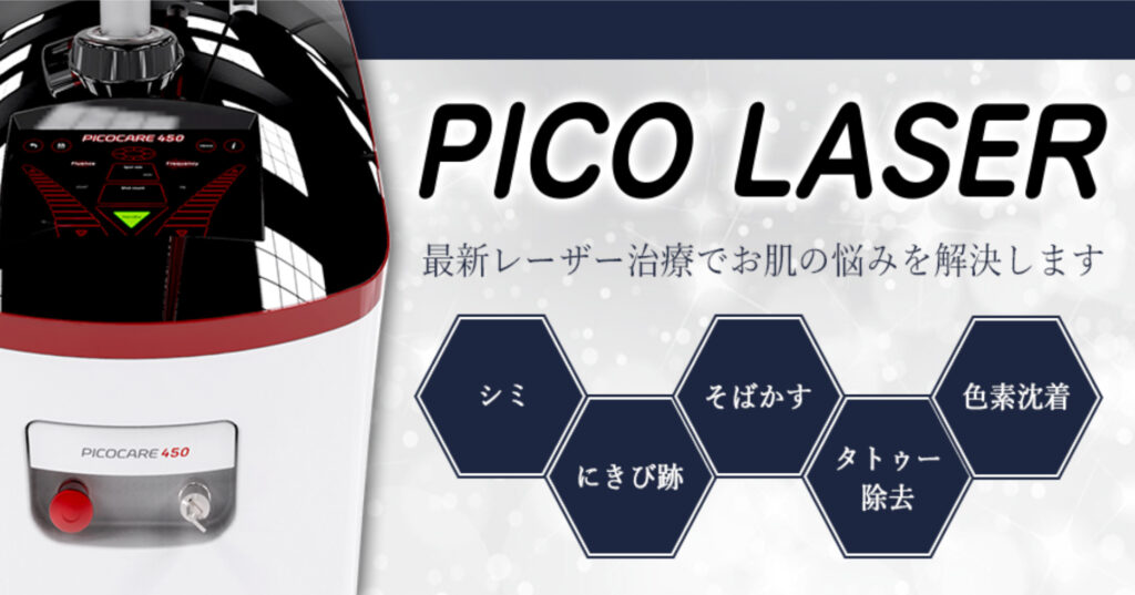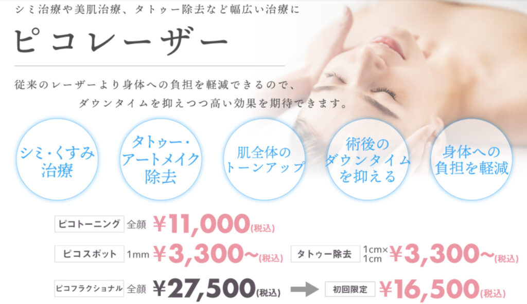 メニューではシミをピンポイントで除去する施術(ピコスポット)と、肝斑やくすみ、肌全体のシミにアプローチする施術(ピコトーニング)の2種類から選べます。