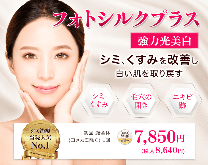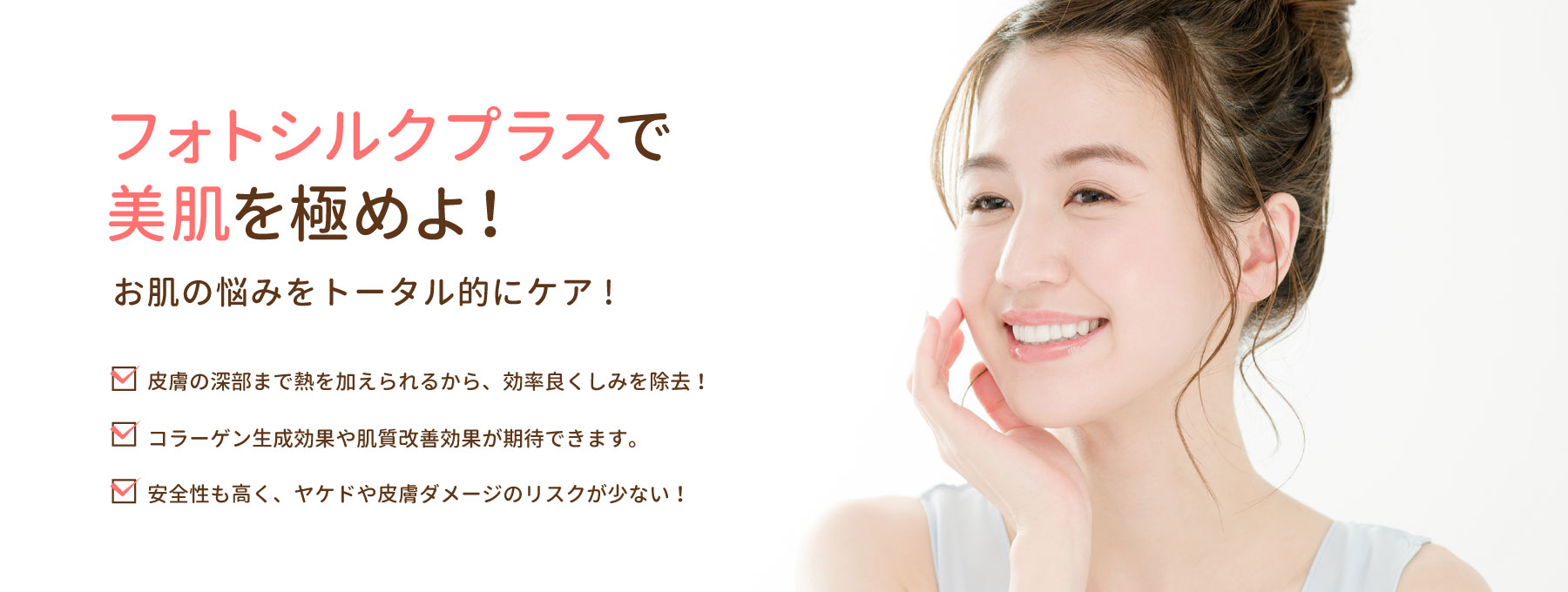 フォトシルクプラスとは、シミ・そばかす・ニキビ・赤ら顔・毛穴の開きなど、さまざまな肌トラブルの改善に有効な光治療器です。中でもシミ取り治療として人気のある施術方法です。